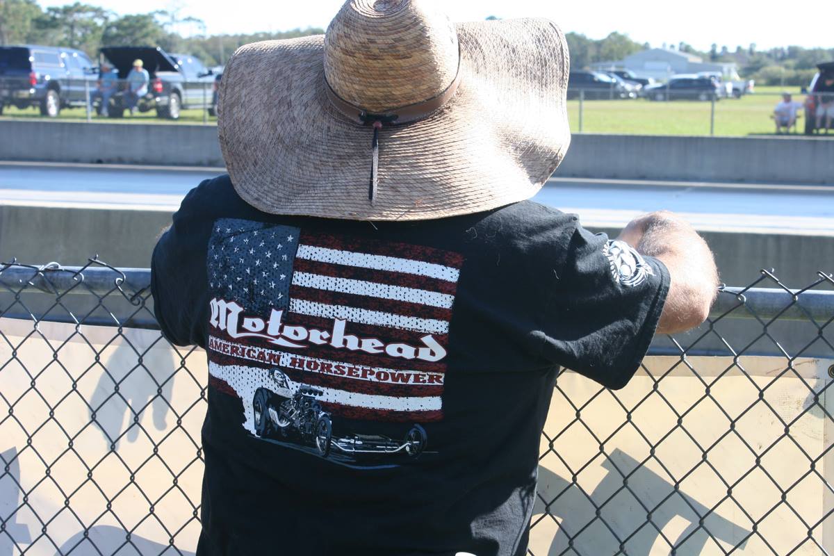 Nostalgic Front Engine Dragster American Flag Design printed on heavyweight 6 oz 100% cotton T-shirt. #1 USA front chest print and Motorheadshirts logo on right sleeve.
