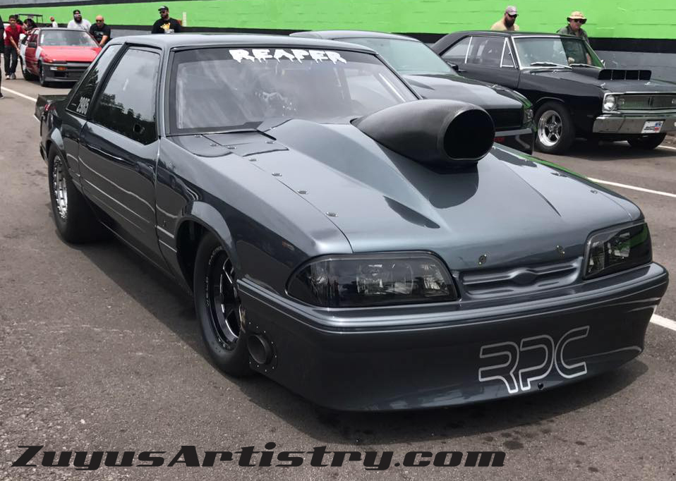 Car is wrapped with Avery red metallic. Graphics on hood scoop and sides is Avery carbon fiber and Avery brushed steel. headlights and grille are airbrushed urethane basecoat. Procharger logo is laminated-die cut digital print with brushed steel overlay. Click for detail photos.